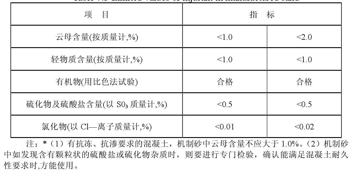 人工砂中的石粉含量和泥塊含量首先應(yīng)符合下表的規(guī)定。在一定情況下可以將Ⅱ類的石粉含量放寬到7%左右。